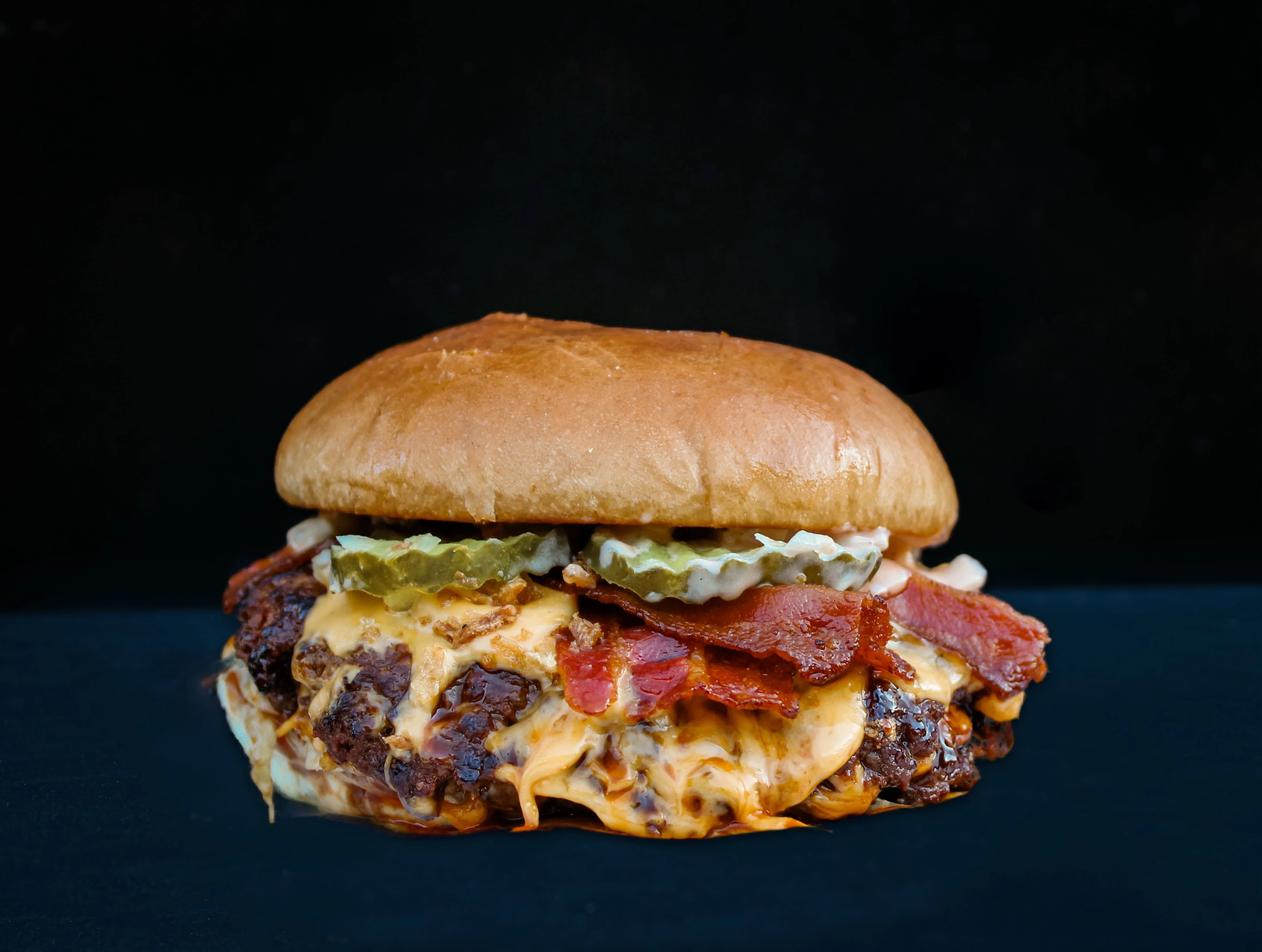 €142x Angus beef, 4x cheddar, sla, 4x bacon, augurk, huisgemaakte saus en ui